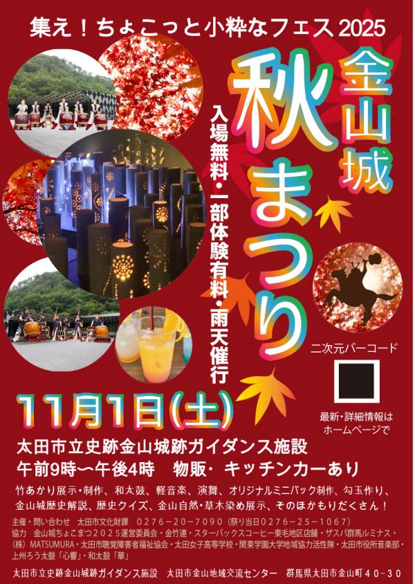 明日11月1日(土)、太田市史跡金山城跡ガイダンス施設にて「集え!ちょこっと小粋なフェス『金山城秋まつり』2025」が開催されます!