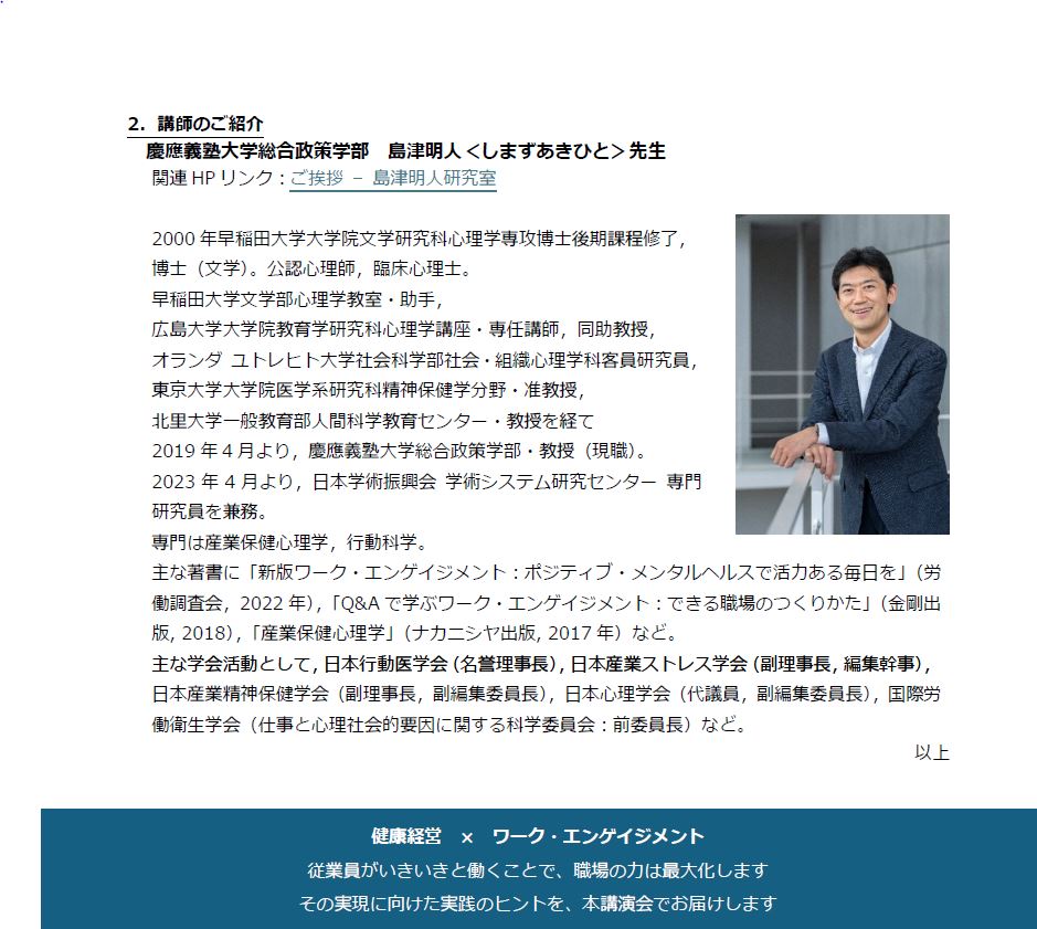 今回の講師は「健康経営×ワーク・エンゲイジメント」の第一人者である