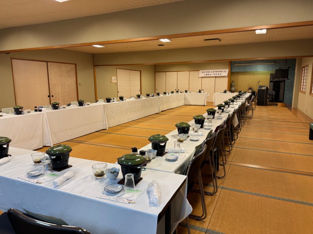 この太田市新田商工会工業部会の忘年会はちょっと違っていて、参加メンバーが自社のPRができるんです。