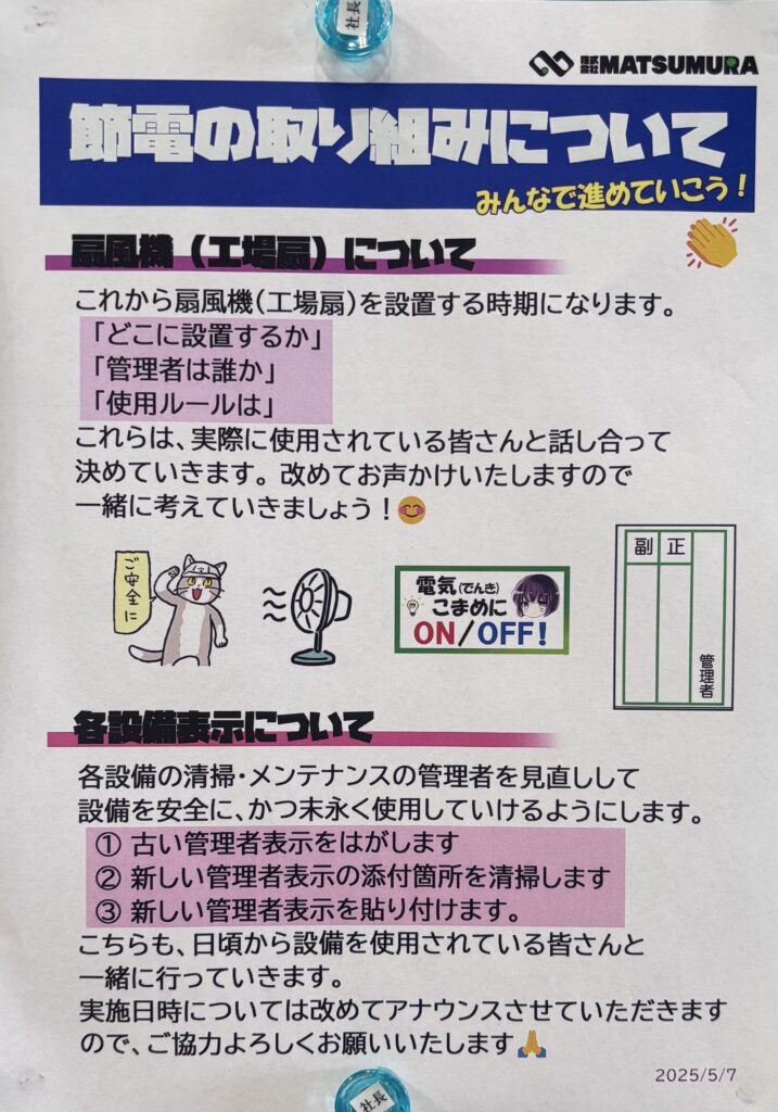 今後も、設備改善と日常の省エネ行動を両輪として、持続可能な環境づくりに取り組んでまいります。
