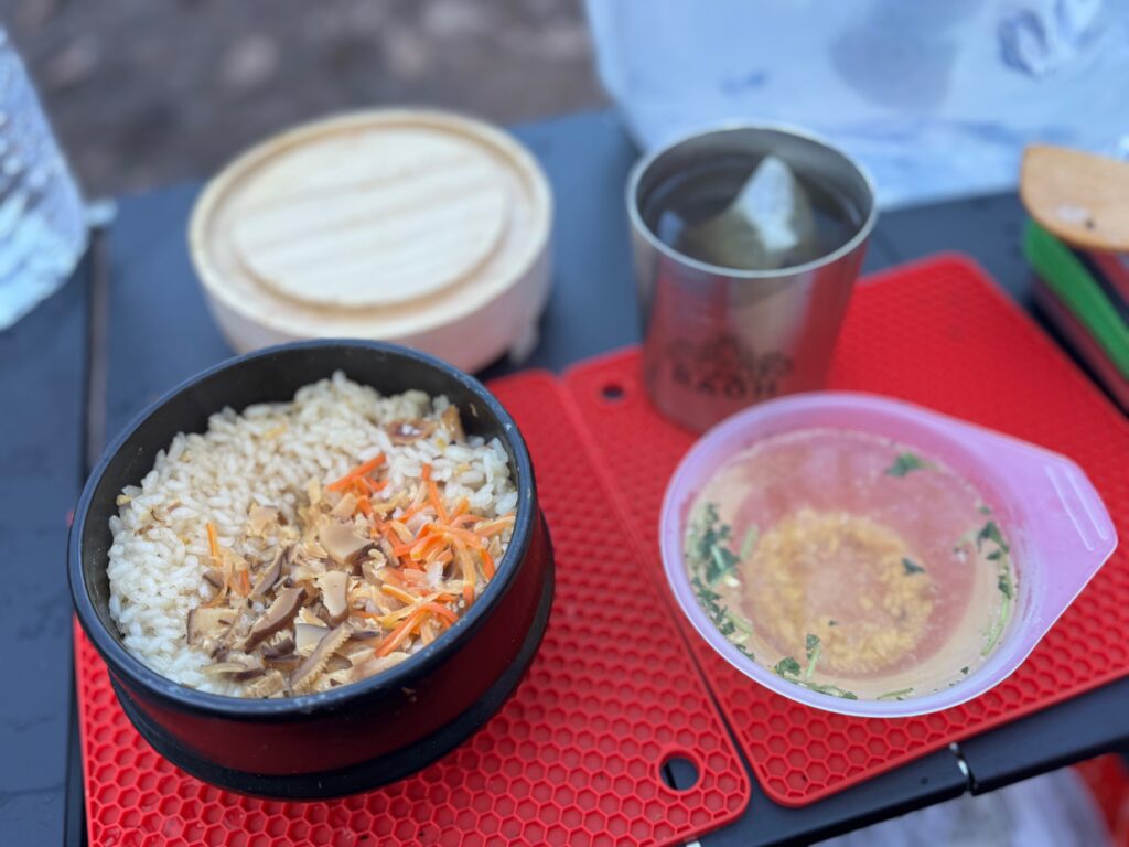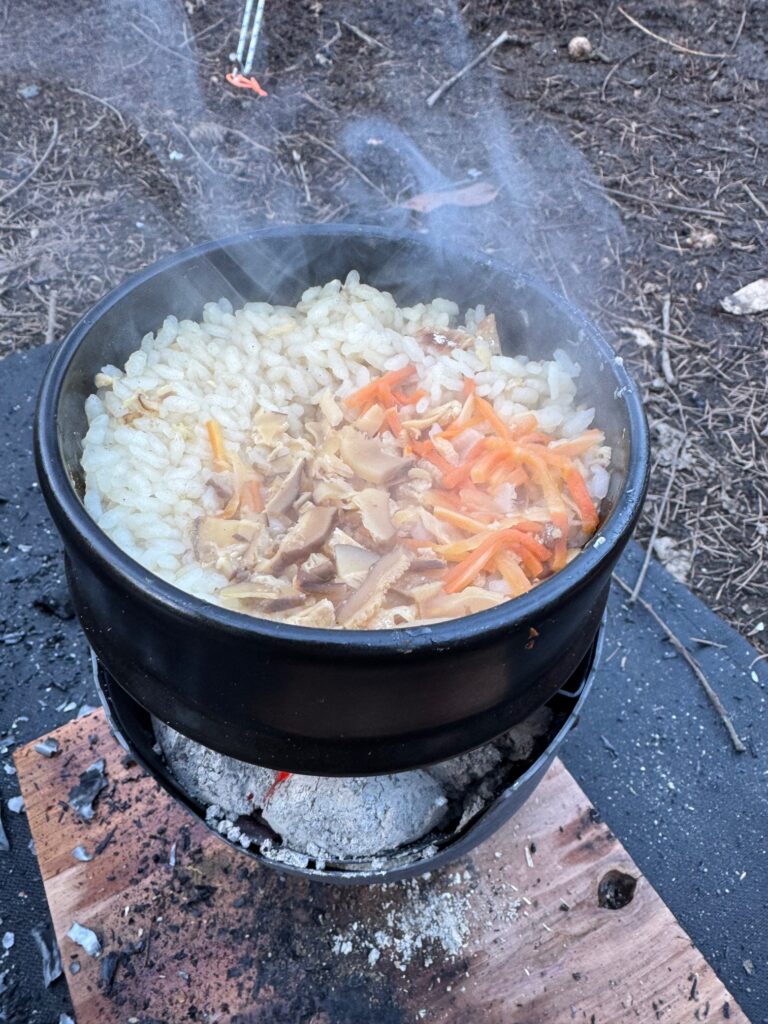 - ミニかまど&羽釜土鍋(LOGOS): 朝晩しっかり炊き込みご飯を炊きました。外で食べる炊きたてご飯の美味さは、格別ですね。