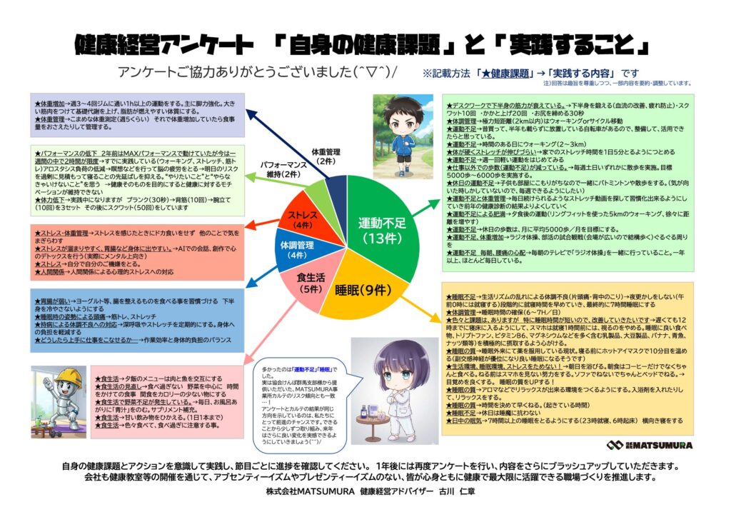 今回のアンケートでは、社員一人ひとりが自身の健康課題と向き合い、具体的なアクションプランを作成してもらいました。