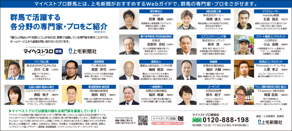 上毛新聞社様が運営されている「マイベストプロ群馬」に登録されている「幅広い分野のプロ」が、上毛新聞にて定期的に紹介されています。(上記は2025年12月30日掲載分)